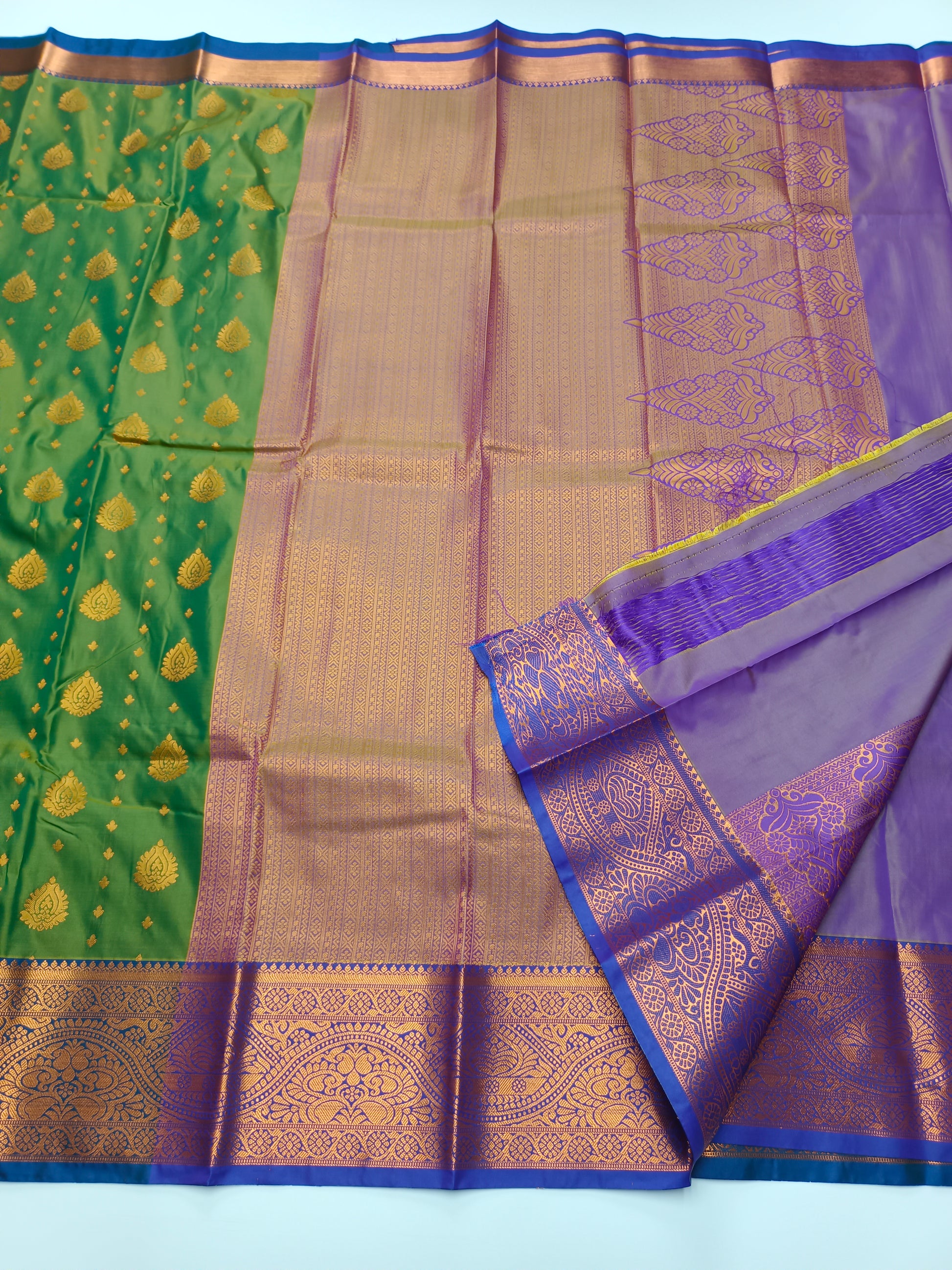 MINT GREEN COLOUR BODY, ALL OVER ZARI BUTTA, CONTRAST PALLU AND BLOUSE , RICH ZARI BORDER