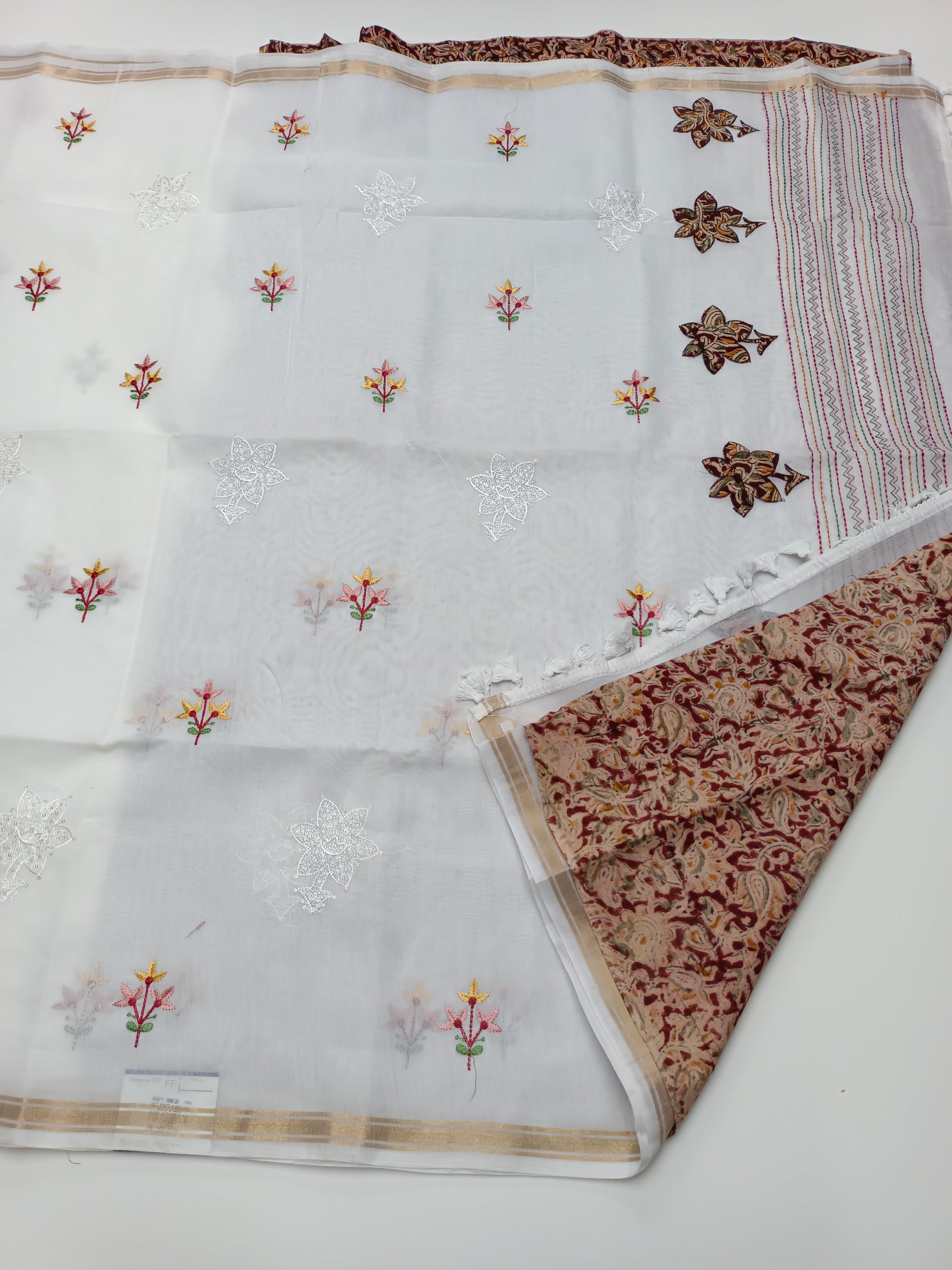 WHITE COLOUR BODY, ALL OVER THREAD BUTTA, SELF PALLU AND CONTRAST BLOUSE , SMALL TISSUE BORDER