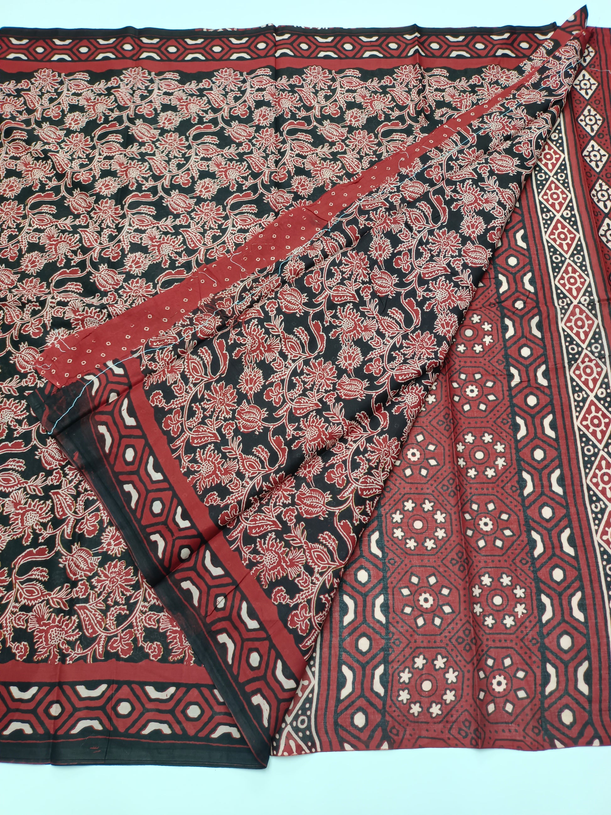 BLACK COLOUR BODY, ALL OVER FANCY PRINTED, CONTRAST PALLU AND SELF BLOUSE , FANCY PRINTED BORDER