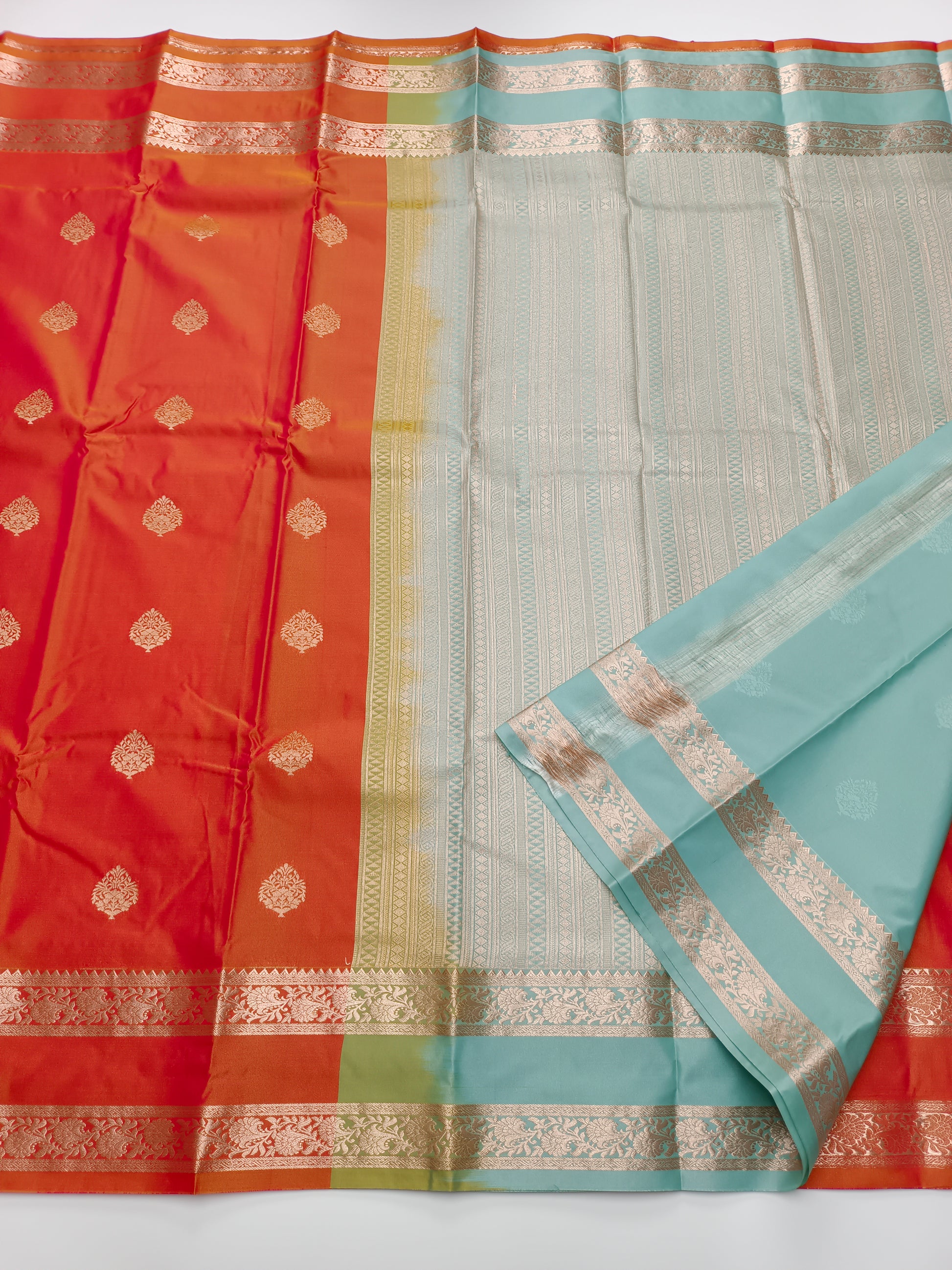 ORANGE COLOUR BODY, ALL OVER ZARI BUTTA, CONTRAST PALLU AND BLOUSE , BENTEX ZARI BORDER